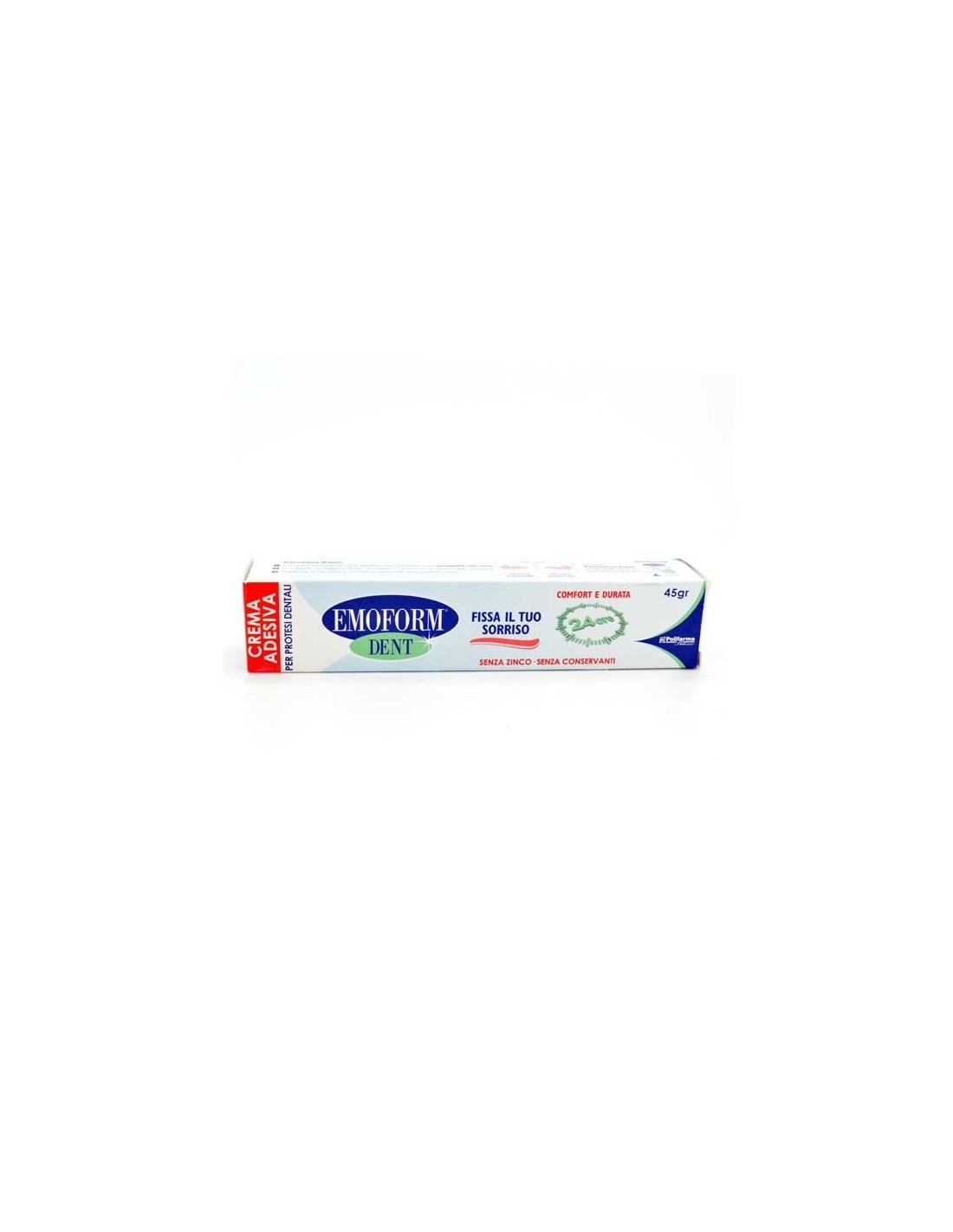Formato: crema adesiva per dentiere, quantita 45 g. Ingredienti non aggressivi, testata per sicurezza e tolleranza. Conservazione a temperatura ambiente, protezione contro l umidita. Conforme alle norme di igiene orale e vendibile senza prescrizione medica.